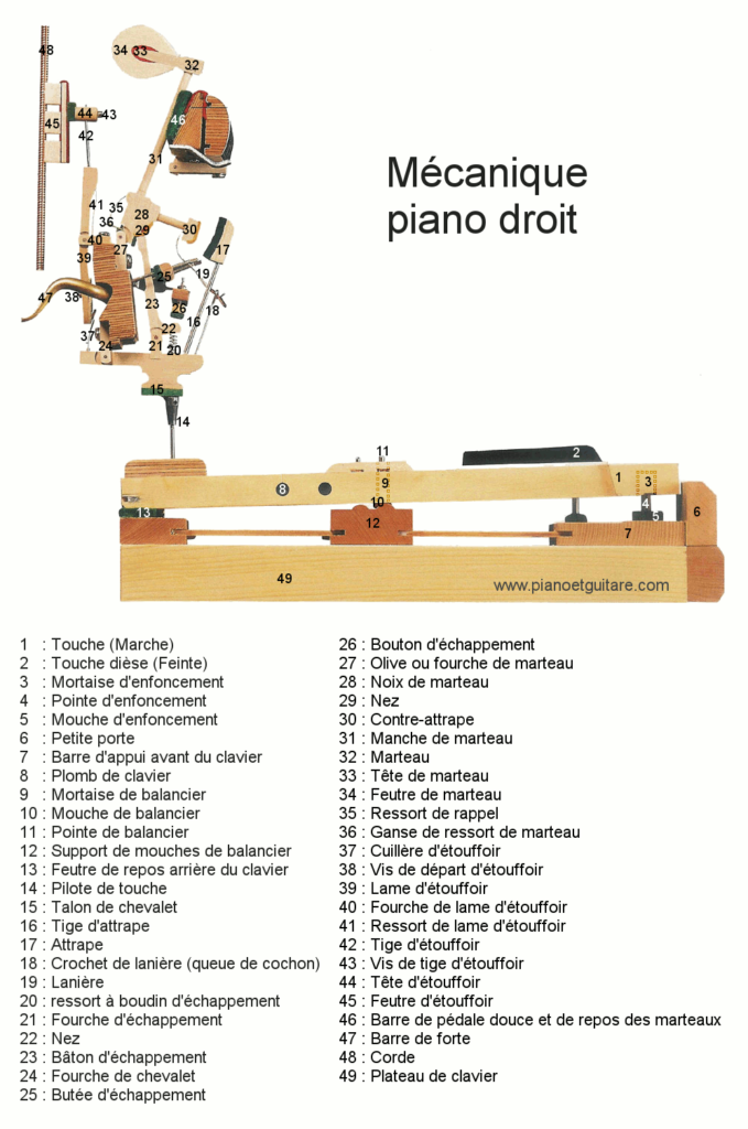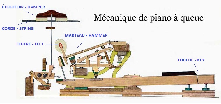 Connaissances techniques, la différence de mécanique d’un piano droit et d’un piano à queue :